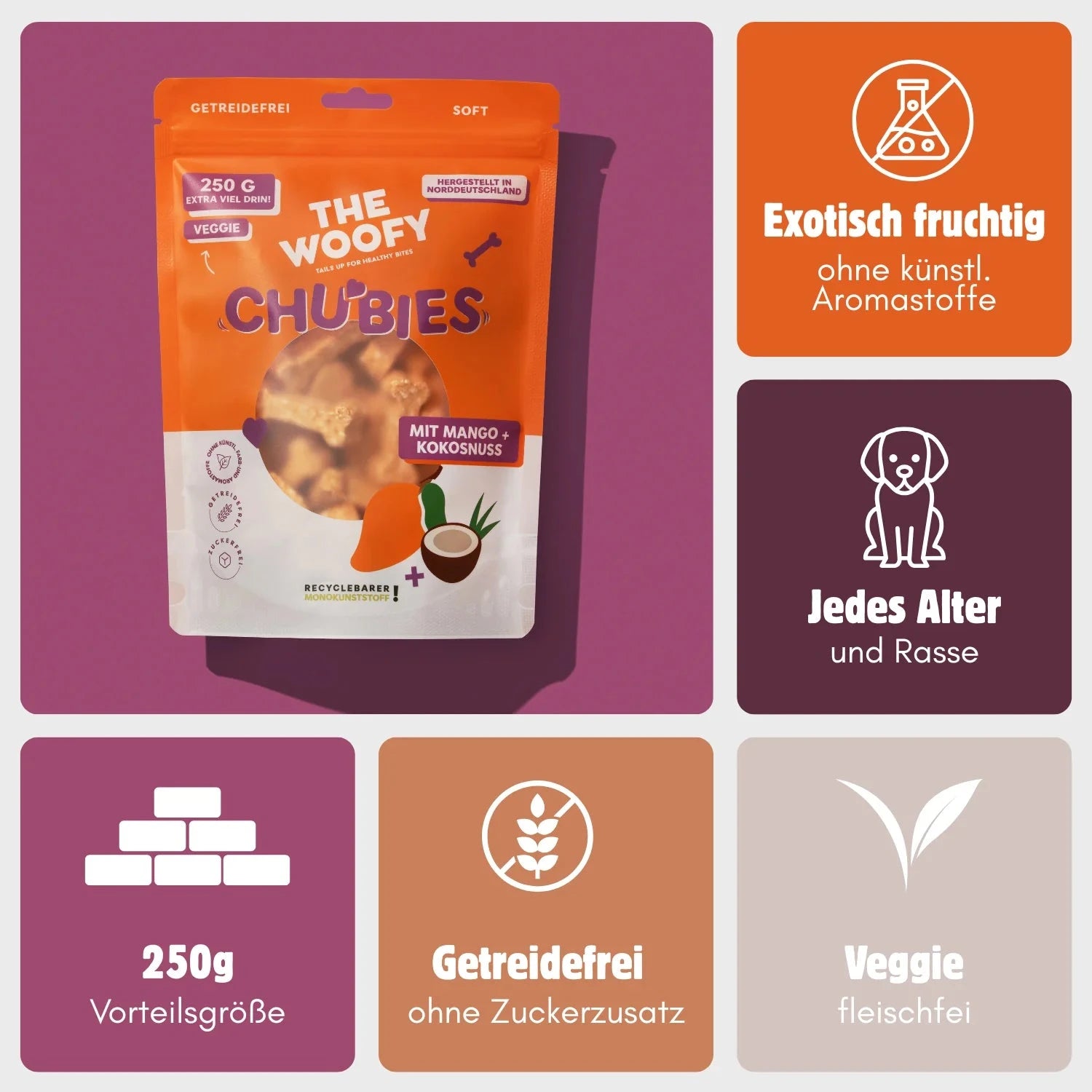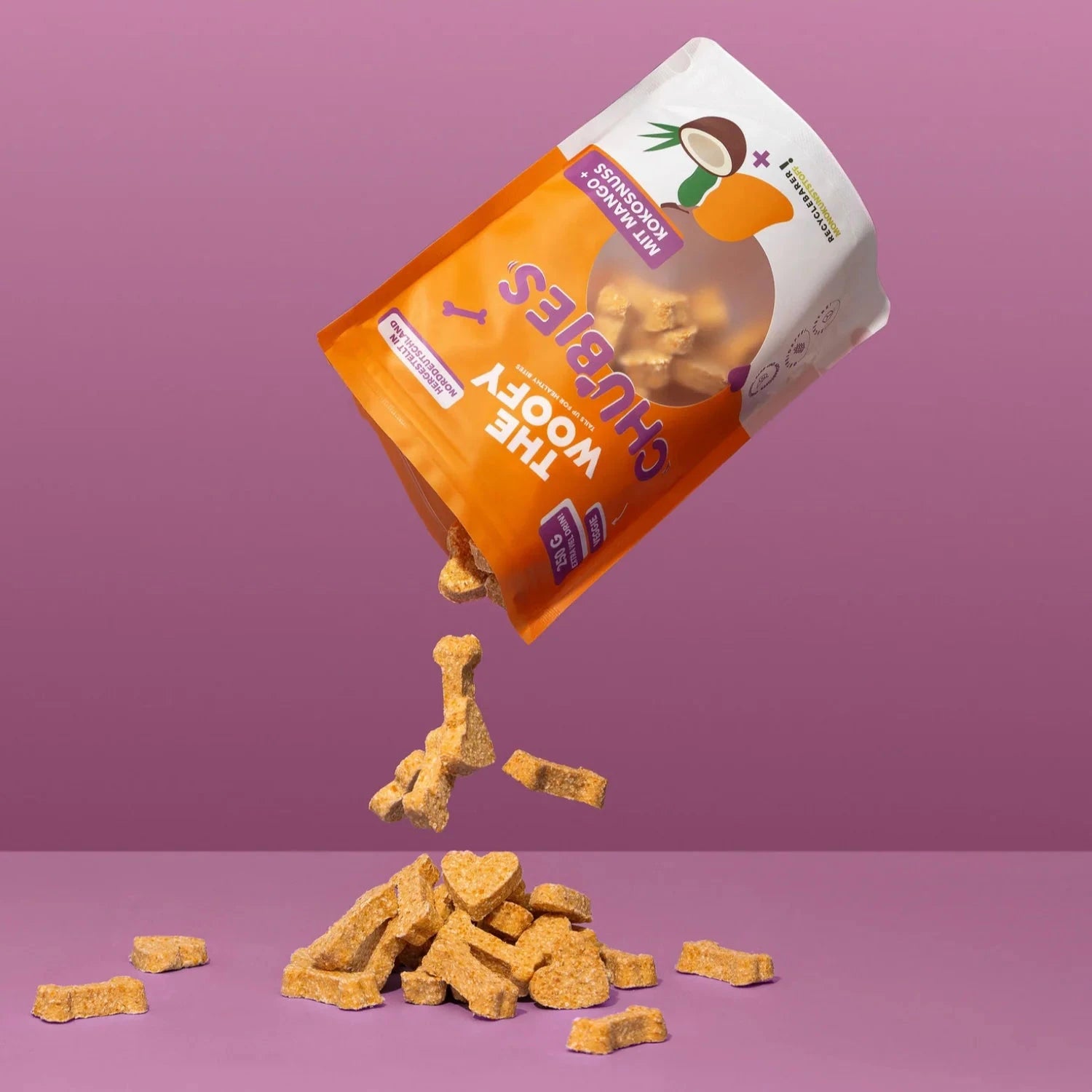 50% Kartoffeln, 18% Mango, 8% Kokosraspeln, Vollei, Erbsenprotein, pflanzliches Glycerin, Erbsenstärke, Cellulose