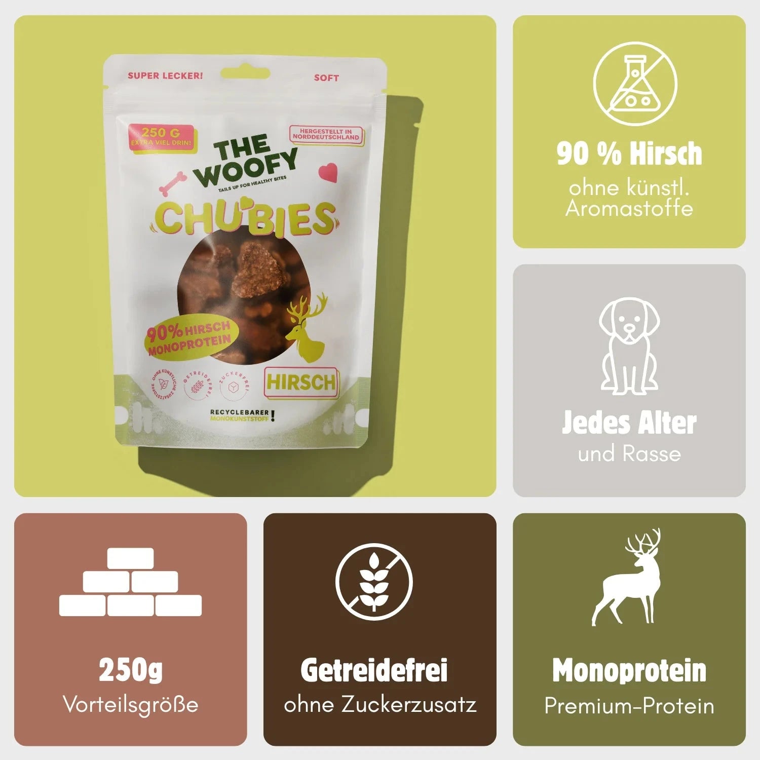 90% Hirsch, Erbsen, Cellulose, pflanzliches Glycerin