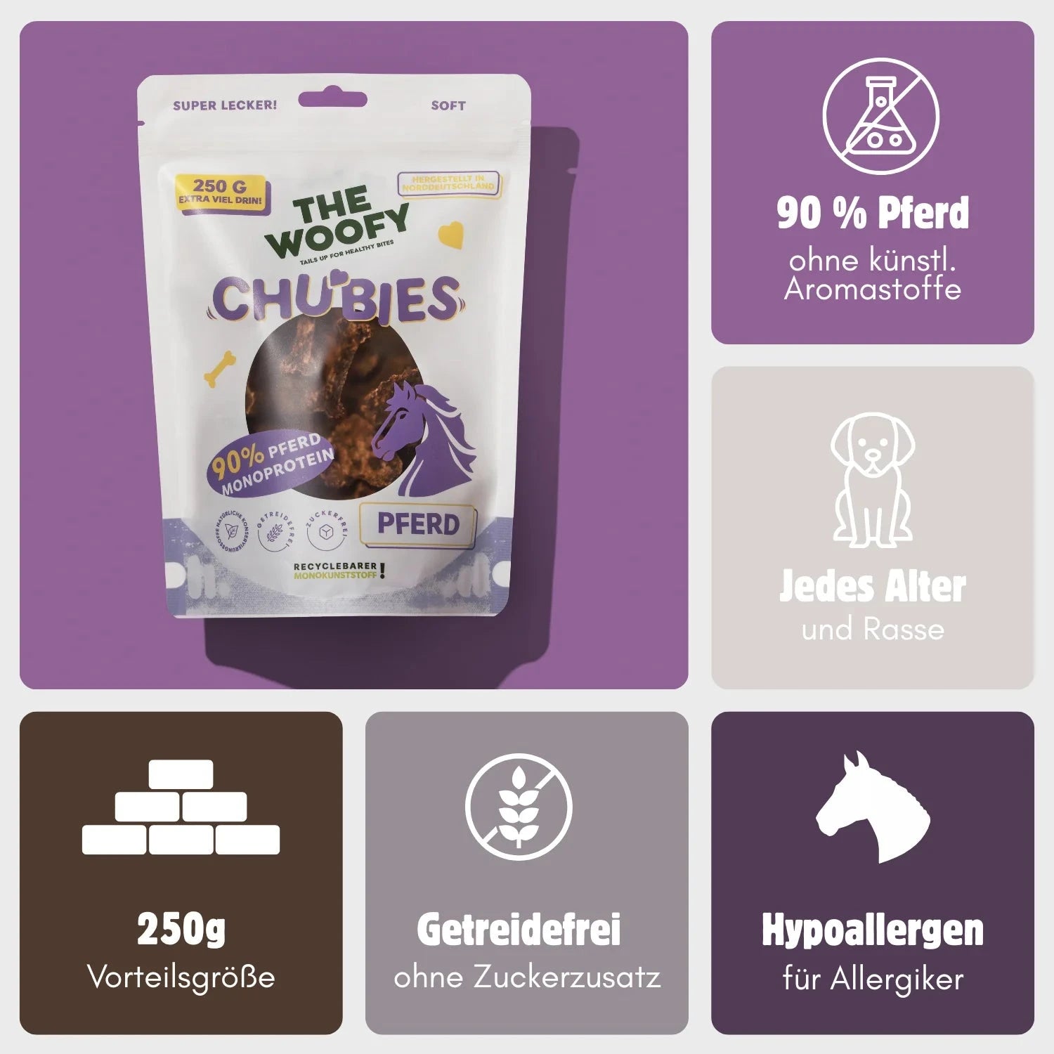 90% Pferd, Erbsen, Cellulose, pflanzliches Glycerin, Salz