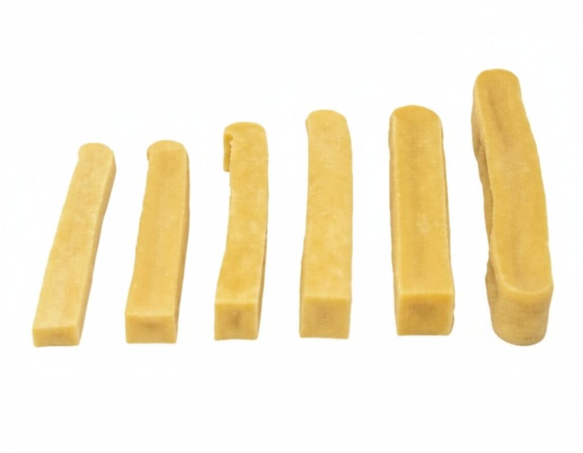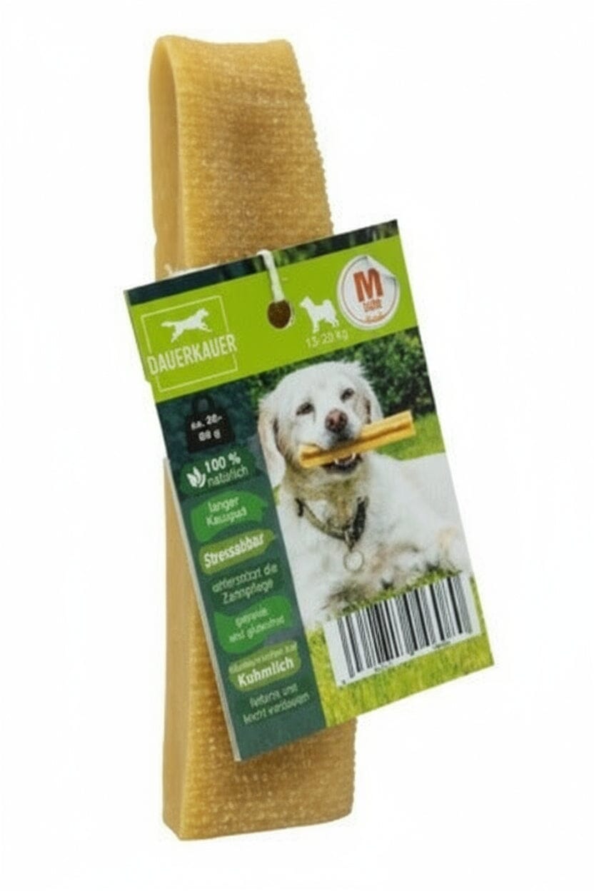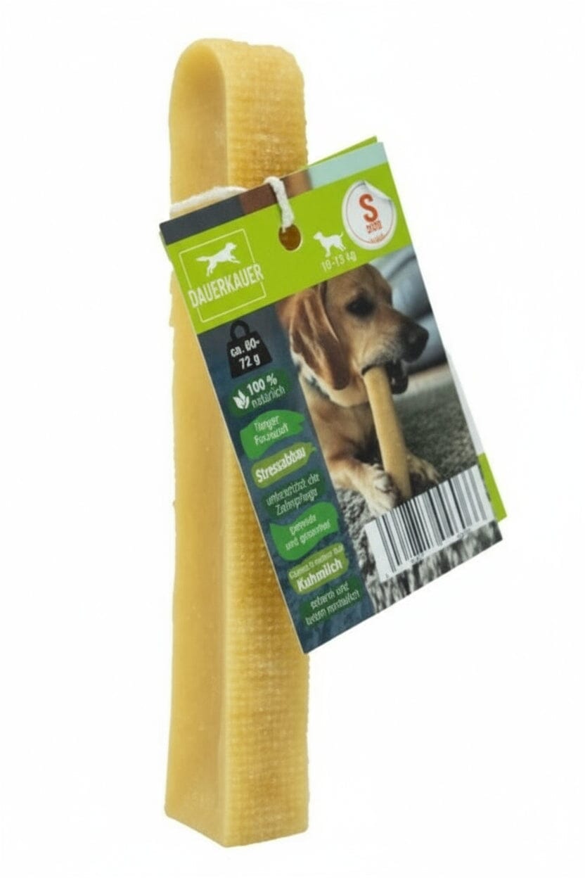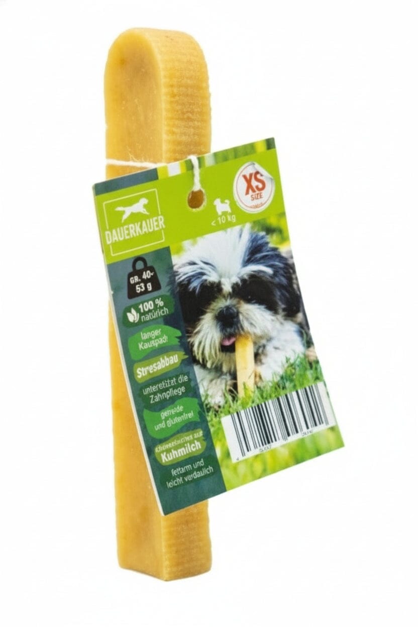 Der DAUERKAUER besteht aus sehr hart getrocknetem Käse und reinigt so ganz nebenbei auch noch die Zähne deiner Fellnase.
