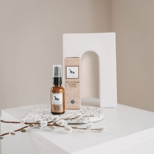 Das First Aid Balsam von LILA LOVES IT hilft eurem Vierbeiner bei Hautverletzungen und Hautirritationen. Es sorgt für Zellerneuerung und mindert den Juckreiz. Durch die natürlichen Inhaltsstoffe wie Aloe Vera, Hanföl und Nachtkerzenöl wird die Haut eurer Fellnase sanft gepflegt und aufgebaut. Das Balsam ist von Tierärzten entwickelt worden und eine tägliche Anwendung bei empfindsamen Stellen wird empfohlen.