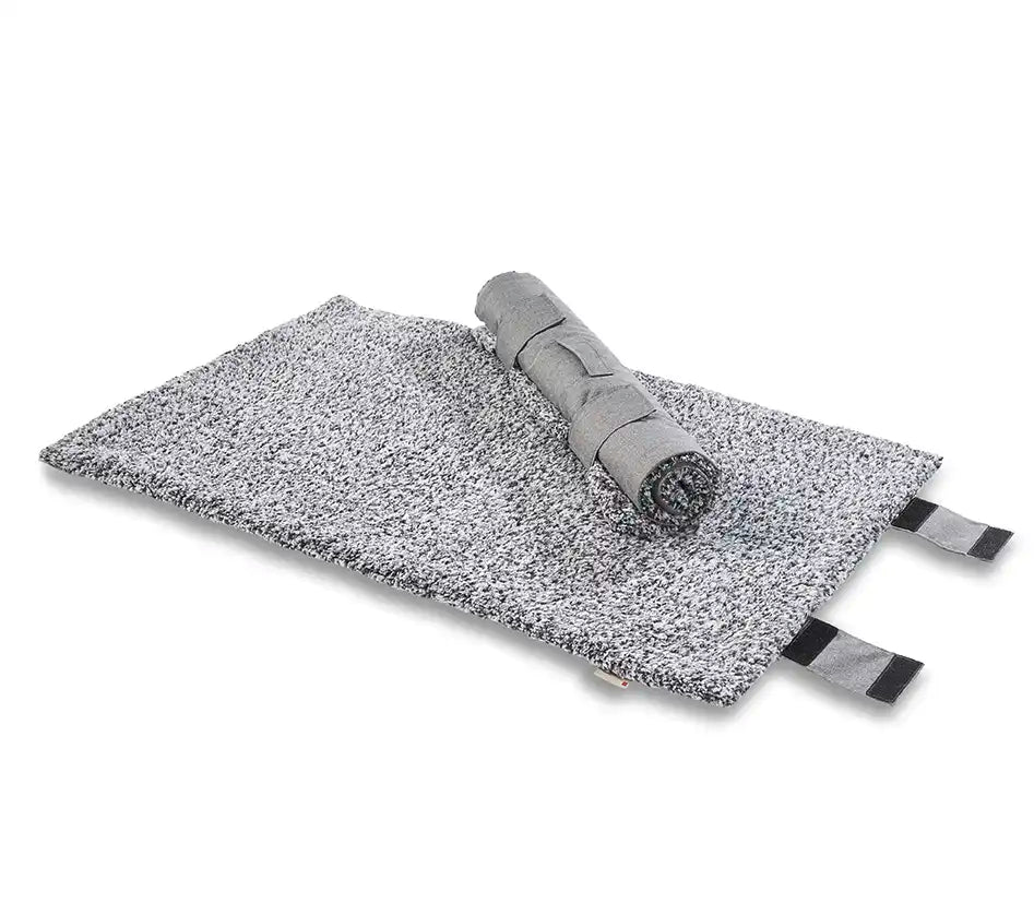 Die wasserabweisende Unterseite schützt zuverlässig vor Nässe und Schmutz, während das zeitlose Salt & Pepper-Design zu jedem Outfit passt. Nach dem Einsatz lassen sich die Klettverschlüsse einfach schließen, sodass die Decke sauber bleibt.